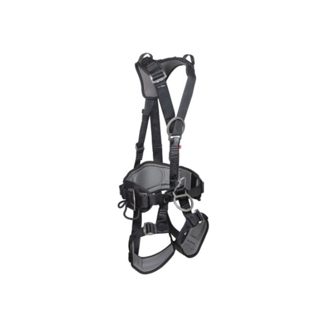 Possui 5 (cinco) pontos de ancoragem em argolas de aço, sendo 01 (um) localizado no ponto peitoral, 01 (um) localizado no ponto dorsal ambos indicados para conexão de talabarte contra queda e trava quedas, ponto abdominal indicado para ascensão, descida e posicionamento e 01 (um) ponto composto de 02 (duas) argolas de aço localizadas na cintura indicadas para talabarte de posicionamento.