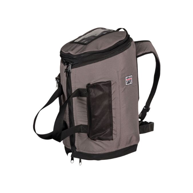 Possui compartimento superior com fechamento circular através de zíper, para acomodação de capacete e bolso interno telado para transporte de óculos (EPI)