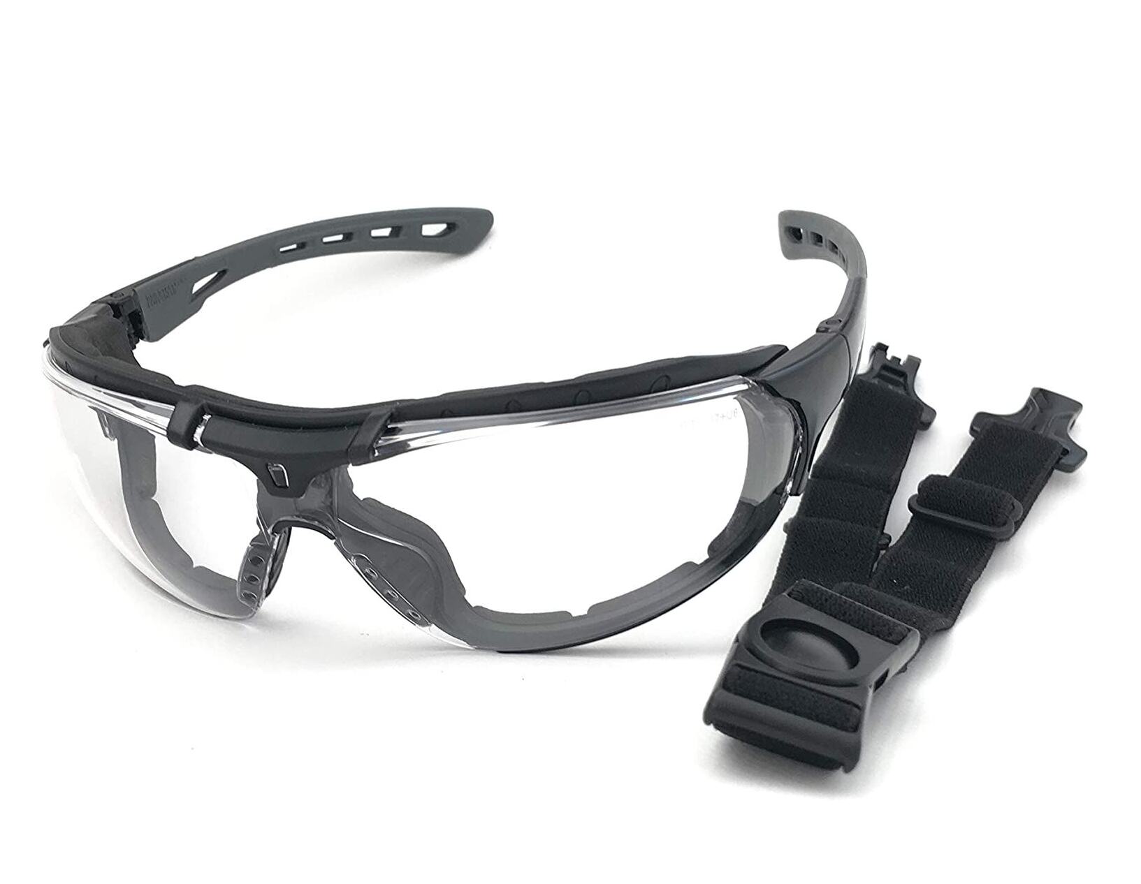 Óculos de segurança constituídos de armação confeccionada em policarbonato, com revestimento de material de elastómero termoplástico, lentes em uma única peça