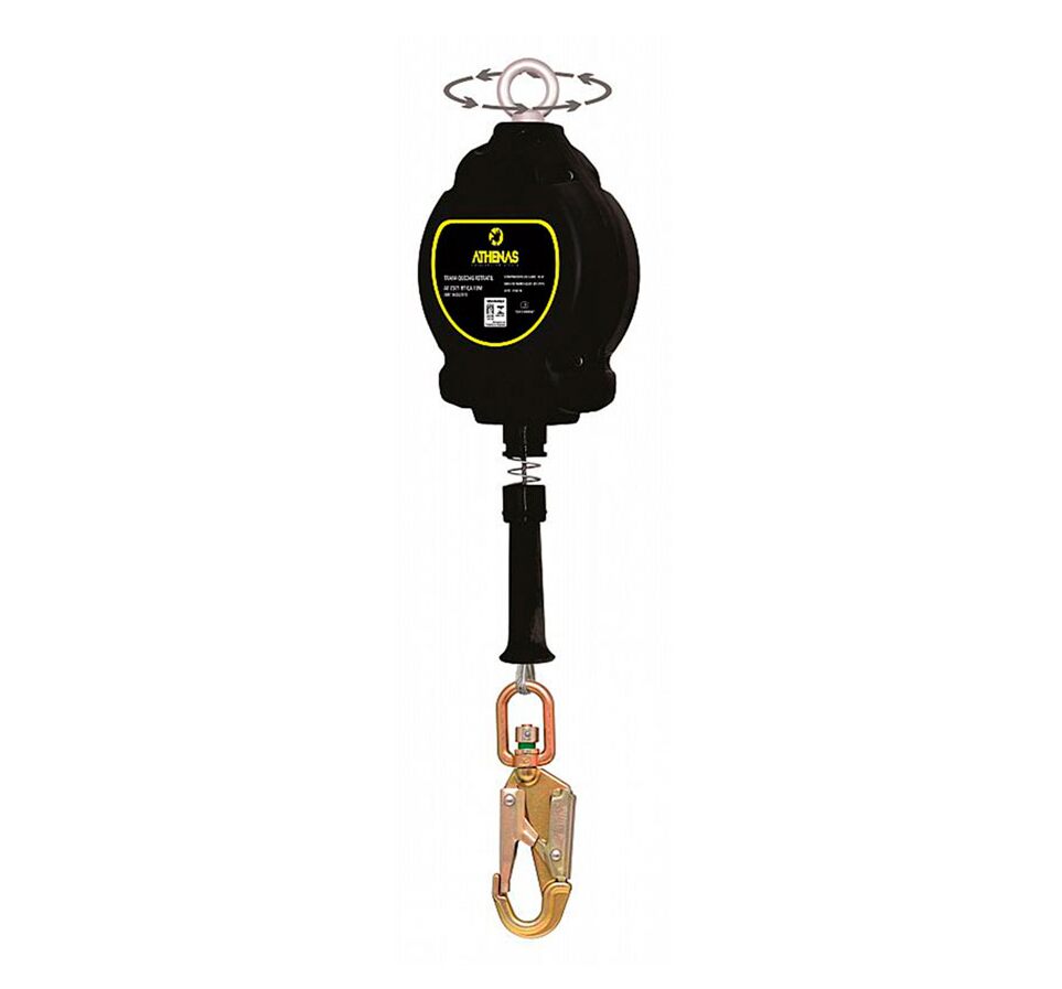 Trava quedas retrátil com 10 metros em cabo de aço com diâmetro de 5mm. Invólucro de polímero